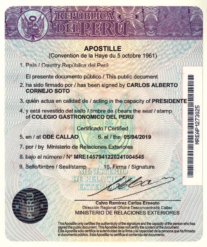 Podrá obtener una Apostilla registrada en la Cancillería del Perú del Ministerio de RR.EE con valor oficial en el extranjero (en más de 150 países en todo el mundo, en amparo a la Convención de la Haya).P